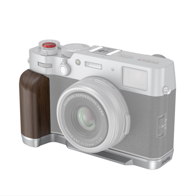 La empuñadura de madera SmallRig en forma de L para las cámaras FUJIFILM X100VI/X100V (plateada) ofrece un diseño ergonómico de madera que mejora la comodidad y la estabilidad del agarre. Esta empuñadura ligera (77 g/2,7 oz) está equipada con una placa de fijación rápida Arca-Swiss para un montaje sencillo e incluye también un botón de disparo y una cubierta para la zapata con un estampado exclusivo de FUJIFILM.