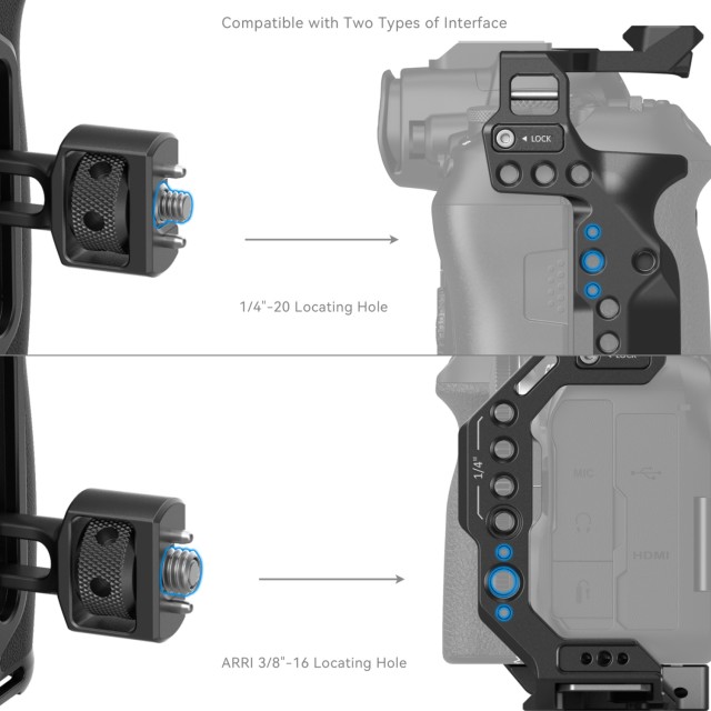 Compatibilidad: Jaulas o placas de montaje con orificios de fijación laterales de 1/4"-20 o orificios de fijación de 3/8''-16 ARRI