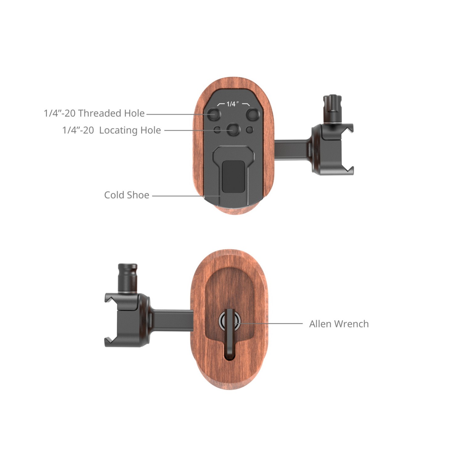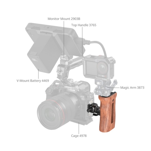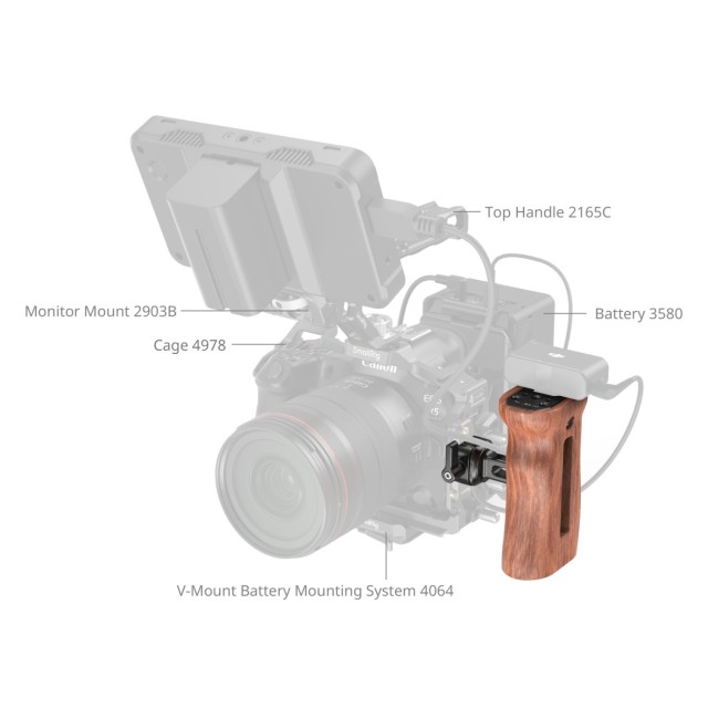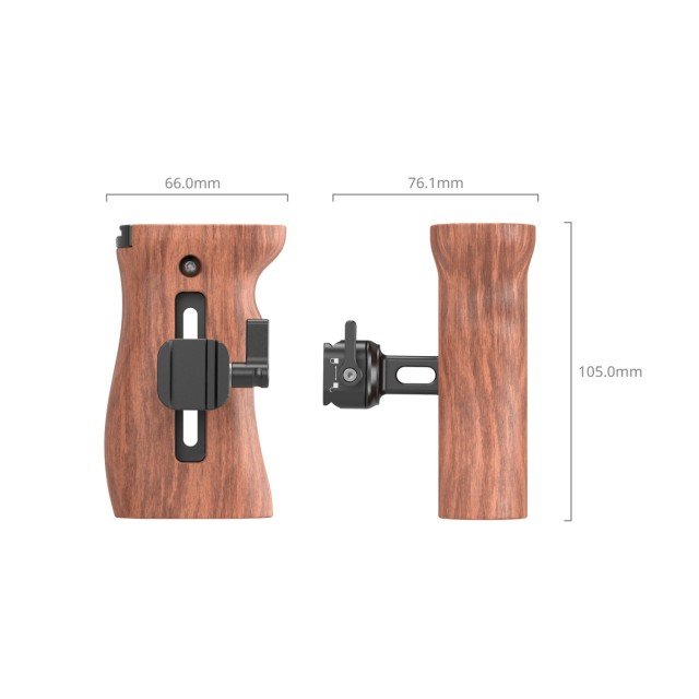 La empuñadura lateral de madera SmallRig con abrazadera NATO 2187C está diseñada para grabar cómodamente a mano alzada. Se fija de forma segura a las jaulas con rieles NATO mediante la abrazadera NATO y una llave Allen. La empuñadura se puede desmontar fácilmente con una llave Allen, lo que permite cambiar rápidamente entre su uso en el lado izquierdo y derecho, y ofrece un ajuste vertical para un control óptimo. En la parte superior de la empuñadura hay una montura tipo cold shoe para fijar micrófonos o flashes, junto con dos orificios roscados de 1/4"-20 y un orificio de posicionamiento de 1/4"-20 para fijar brazos tipo magic arm o soportes de monitor para ajustes de monitorización.