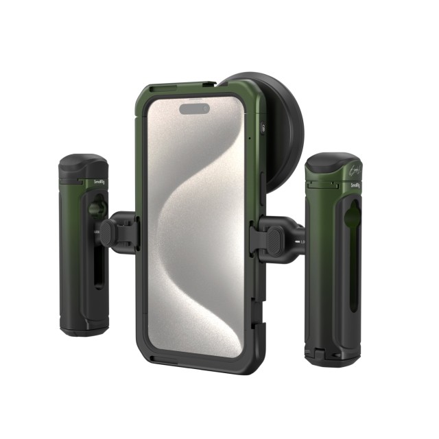 El kit de vídeo móvil SmallRig x Brandon Li para iPhone 15 Pro Max Co-design Edition 4407B incluye dos empuñaduras para garantizar una grabación de vídeo y vlogs estables; el control inalámbrico permite grabar con un solo clic. La jaula cuenta con varios orificios con rosca de 1/4"-20 y pies de fijación para acoplar el mango, el trípode, el micrófono, la luz…
