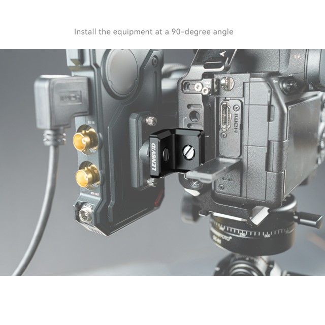 1. Ofrece una solución compacta para la instalación de dispositivos y accesorios, como transmisores de imagen inalámbricos, monitores, placas de montaje V-mount, etc., en un ángulo de 90°, lo que permite un equipo de cámara más compacto.