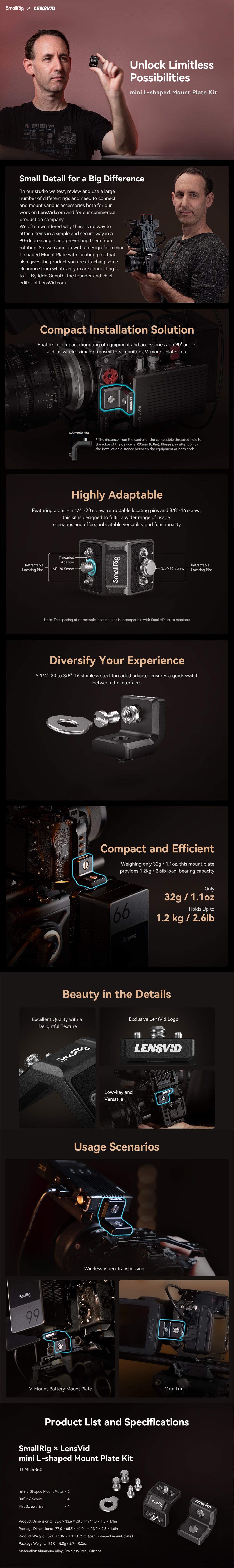 El kit de placa de montaje en forma de L SmallRig x LensVid MD4360 ha sido diseñado por Iddo Genuth, cofundador y editor de LensVid.com, un sitio web dedicado a la fotografía y el vídeo que lleva 10 años en funcionamiento, y del programa SmallRig DreamRig. Este kit ofrece una solución más compacta para montar dispositivos y accesorios, como transmisores de imagen inalámbricos, monitores, placas con montura en V, etc., en un ángulo de 90° con respecto a la cámara. También se suministra con cuatro soluciones de montaje: tornillo de 1/4"-20, tornillo de posicionamiento de 1/4"-20, tornillo de 3/8"-16 y orificio de posicionamiento ARRI de 3/8"-16, para que nuestros usuarios puedan adaptarse a más escenarios de uso. El dispositivo cuenta con una almohadilla de silicona antideslizante integrada que protege la cámara de arañazos y garantiza una fijación segura. Su capacidad de carga de 1,2 kg/2,6 lb es compatible con la mayoría de los transmisores de vídeo inalámbricos y accesorios.