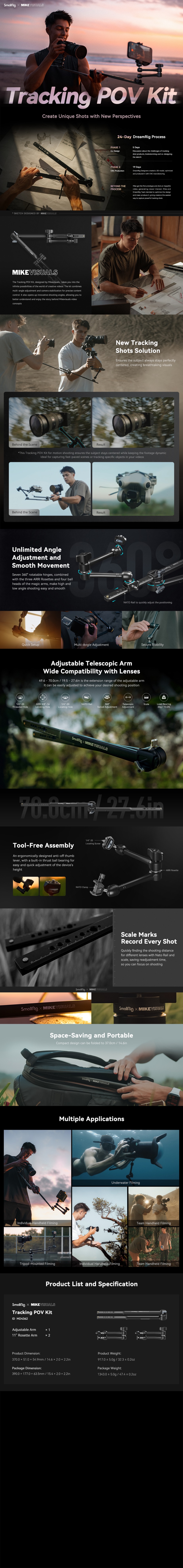 El kit SmallRig x Mikevisuals Tracking POV Kit MD4362 ha sido diseñado por Mikevisuals, una empresa que, en el marco del programa DreamRig de SmallRig, se dedica al cine, el turismo, la ciencia y la tecnología. Su objetivo es facilitar el seguimiento de las tomas, el acercamiento y el alejamiento, etc. El brazo ajustable incluye soportes para accesorios, como orificios roscados de 1/4"-20, orificios de posicionamiento ARRI de 3/8"-16 y rieles NATO, que conectan rápidamente los brazos mágicos y ayudan a ajustar la distancia de filmación. El brazo se puede alargar entre 49 y 70 cm / 19,5 y 27,6 pulgadas y acortar hasta 37 cm para facilitar su almacenamiento, con una capacidad de carga de 3 kg / 6,6 lb en ambos extremos. Ambos rieles NATO miden 20,5 cm / 8,1 pulgadas de largo, son adecuados para diferentes distancias focales de los objetivos y están equipados con escalas para registrar datos de distancia. El brazo de roseta de 11'' con una capacidad de carga de 3 kg también está equipado con un tornillo de 1/4"-20 con pasadores de posicionamiento y un riel NATO.