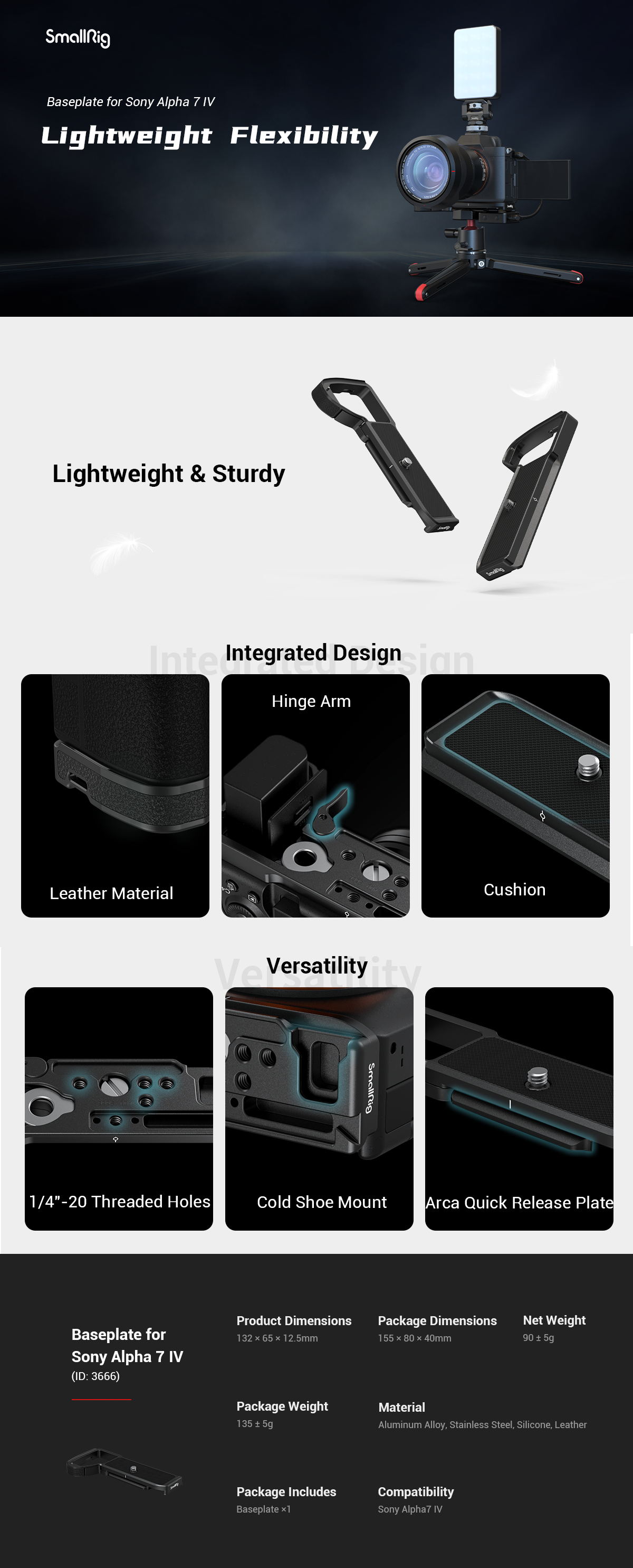 La placa base SmallRig para Sony Alpha 7 V / 7R V / Alpha 7 IV 3666 tiene como objetivo mejorar la experiencia de sujeción y permitir fotografiar tanto con trípode como a mano alzada, al tiempo que protege la parte inferior de la cámara. Se fija a la parte inferior de la cámara mediante un tornillo de 1/4" -20 y un pasador de posicionamiento, y está equipada con una almohadilla de silicona integrada que evita arañazos y deformaciones. En la tapa de la batería hay una llave de husillo que se adapta a la curvatura de la cámara y deja espacio para el meñique para un agarre cómodo; insertada en piel auténtica seleccionada en la placa base, se integra en el cuerpo de la cámara. Los orificios roscados de 1/4"-20 y las zapatas de zapata fría en la parte inferior admiten minitrípodes y micrófonos. Además, la placa base compatible con el sistema Arca permite cambiar rápidamente entre trípode, estabilizador (DJI RS 2 / RSC 2 / RS 3 / RS 3 Pro) y disparo a mano alzada. La llave magnética integrada, de fácil acceso, facilita el desmontaje y el montaje.