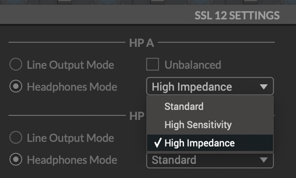 Elige entre 3 modos de funcionamiento diferentes para las salidas de auriculares que mejor se adapten a tus auriculares: Estándar, Alta sensibilidad o Alta impedancia. O bien, puedes optar por reutilizar cada salida HP como salida monofónica balanceada/no balanceada si necesitas salidas adicionales de nivel de línea desde el SSL 12.