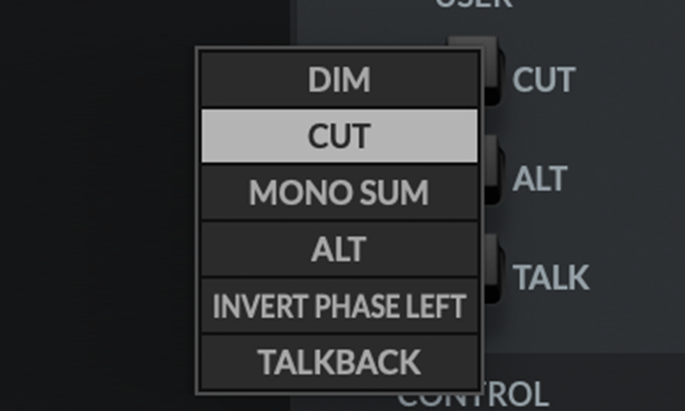 Los 3 interruptores del panel frontal vienen con funciones preconfiguradas: CUT para monitores, ALT para cambiar de altavoz y TALKBACK para activar/desactivar el micrófono, pero puede elegir si desea cambiar estos botones a cualquiera de las siguientes funciones según sus necesidades: DIM, CUT, MONO SUM, ALT, INVERT PHASE LEFT, TALKBACK.