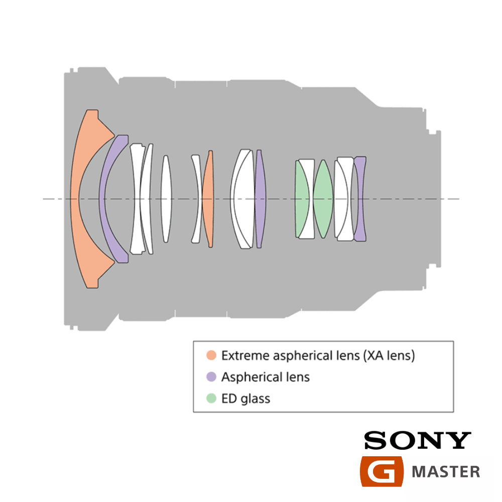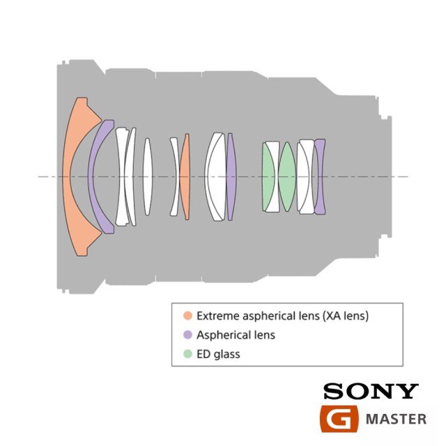 Este objetivo está equipado con dos elementos Sony XA (extremadamente asféricos) con una precisión de superficie de 0,01 micras. La distorsión, que suele producirse en los objetivos gran angulares con zoom, se controla minuciosamente, al igual que el astigmatismo y la curvatura de campo. El poco atractivo bokeh en forma de cebolla se suprime eficazmente gracias a los elementos XA (extremadamente asféricos), de modo que se consigue un bokeh suave y bonito en las zonas desenfocadas.