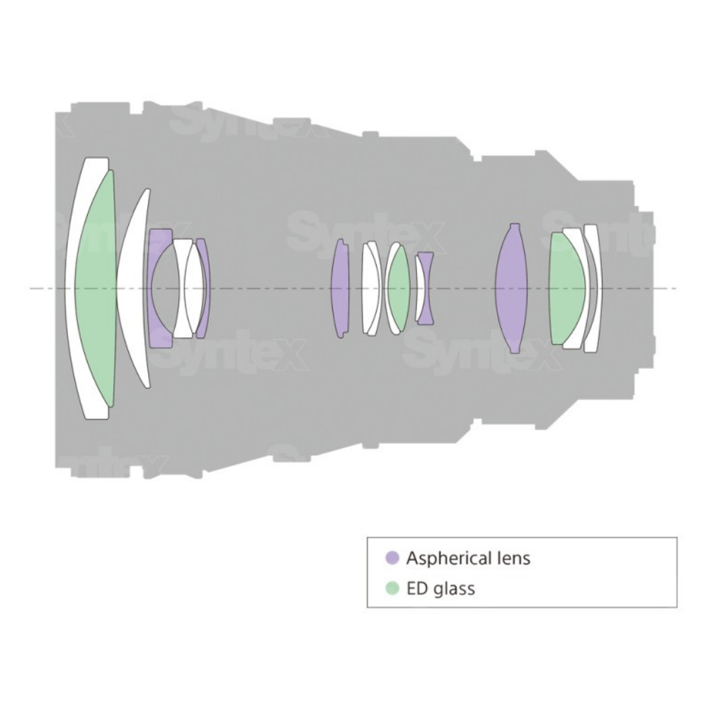Se compone de 18 lentes distribuidas en 12 grupos. En el sistema óptico se utilizan 5 lentes de forma especial con superficie asférica y 3 lentes fabricadas con un cristal ED especial de baja dispersión.