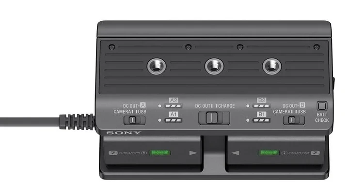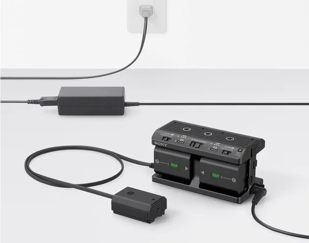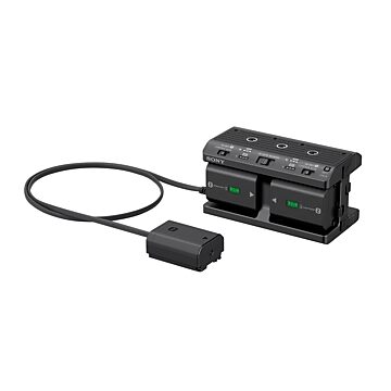 El dispositivo puede cargar hasta cuatro baterías NP-FZ100 en aproximadamente 8 horas (480 minutos). El estado de carga se puede comprobar fácilmente mediante el indicador LED tras pulsar el botón correspondiente. El adaptador ofrece la posibilidad de elegir entre alimentar el dispositivo conectado y cargar las baterías mediante el interruptor DC OUT / CHARGE. Las baterías NP-FW50 sirven únicamente para la alimentación y no se pueden cargar en el adaptador.