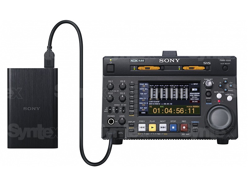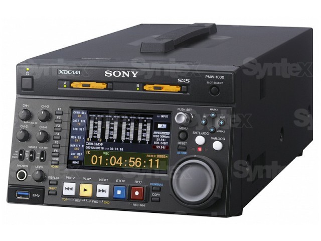 La compacta y asequible grabadora de memoria SxS PMW-1000 cuenta con dos ranuras para tarjetas de memoria SxSExpressCard™, lo que permite una amplia variedad de grabaciones y reproducciones en HD y SD, incluido el formato XDCAM HD422 a 50 Mbps. Esta grabadora de tamaño medio rack cuenta con interfaces SD/HD-SDI e interfaces Gigabit Ethernet (1000BASE-T) para operaciones de red no lineales, así como una interfaz RS-422 y control jog/shuttle para permitir la ingesta y la edición «de tipo lineal».