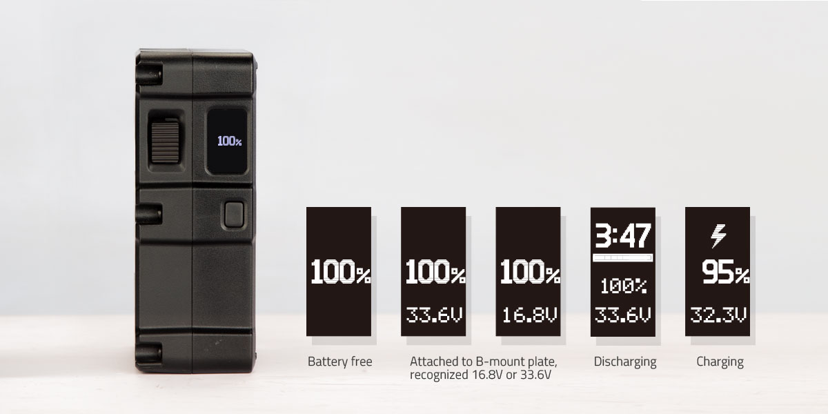 La batería BIVO-200 cuenta con una pantalla OLED que muestra información sobre el estado de la batería y la alimentación, incluyendo el voltaje de salida, el porcentaje de carga, el tiempo de funcionamiento restante y un código de advertencia de protección en caso de detectar una anomalía.