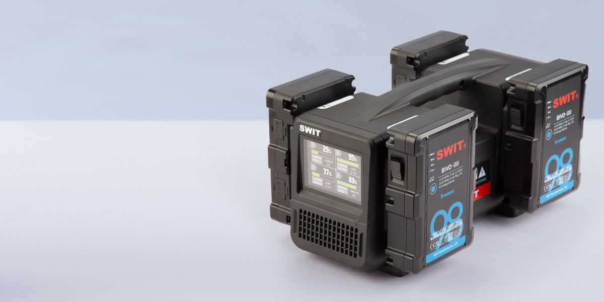 En el cargador SWIT PC-P461B B-mount se pueden cargar 4 baterías BIVO-98 simultáneamente, con una carga rápida de 33,6 V y 44 W. El cargador tarda aproximadamente 3 horas en cargar completamente 4 baterías BIVO-98.