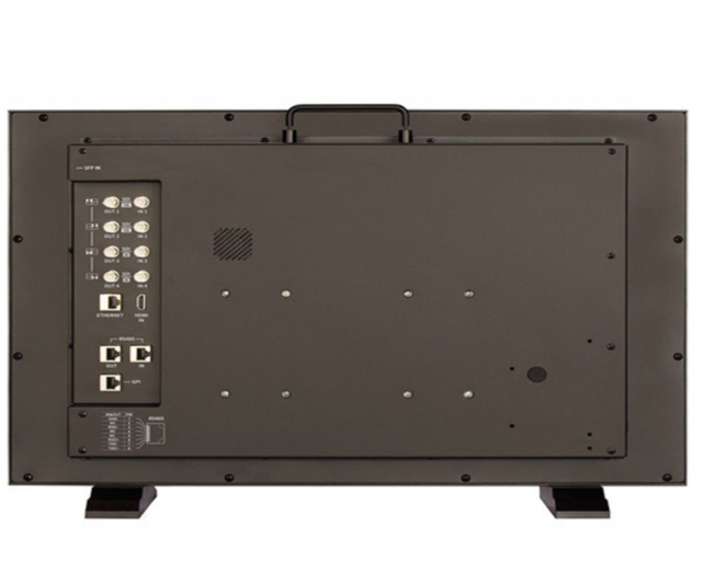 Las conexiones incluyen 4 entradas 12G/6G/3G/HD/SD-SDI y salidas en bucle que admiten 4K de enlace único, 4K de cuatro enlaces y 8K de cuatro enlaces (SQD o 2SI). También ofrece HDMI 2.0 (4K60p) y 12G-SDI opcional o ST2110 IP a través de módulos ópticos SFP. El monitor admite multivisión de 4 entradas mixtas independientes y proporciona para cada ventana forma de onda, vector, medidores de audio y selección de EOTF/gama.