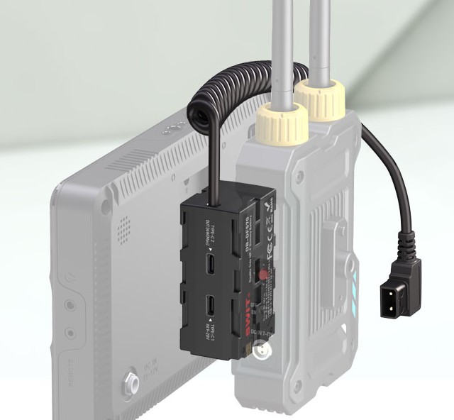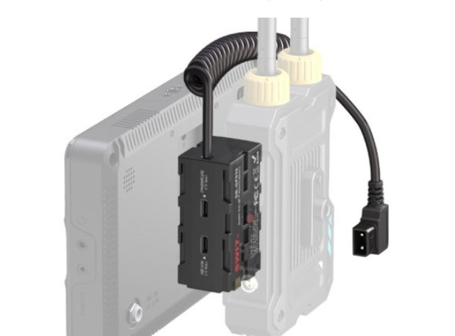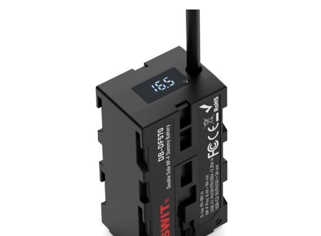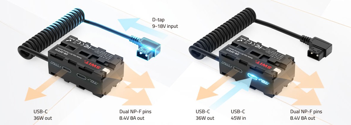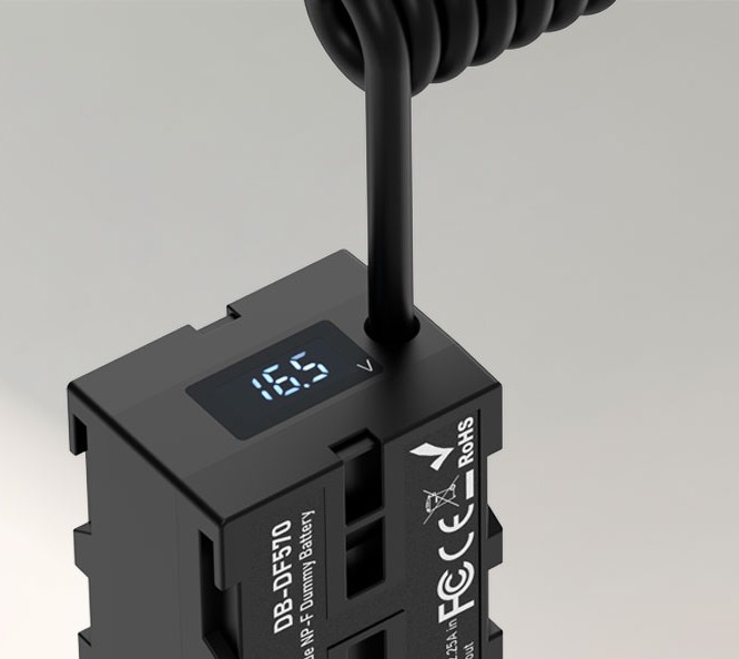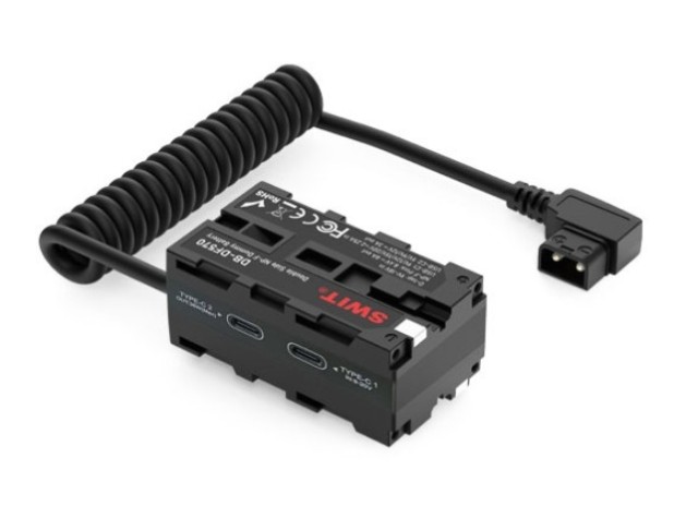La batería ficticia DB-DF570 admite alimentación D-tap de 9-18 V o USB-C PD de 45 W y la convierte en una salida doble NP-F con salida regulada de 8,4 V y 8 A y una salida USB-C PD de 36 W.
