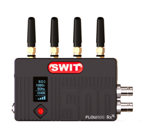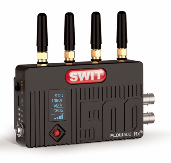 El SWIT FLOW500 Rx es un receptor de vídeo inalámbrico FHD con un alcance de 150 m (500 pies) que utiliza la tecnología KUWI de 5,1–5,9 GHz, salidas duales 3G-SDI y HDMI, una pantalla OLED para visualizar el estado, gran potencia de transmisión a través de paredes, compatibilidad con multidifusión (1 emisor a 4 receptores) y doble cifrado AES128 para una transmisión de vídeo segura y de alta calidad.