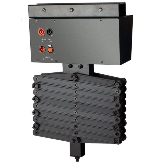 En el panel frontal se puede configurar la dirección DMX para controlar el pantógrafo hacia arriba y hacia abajo.