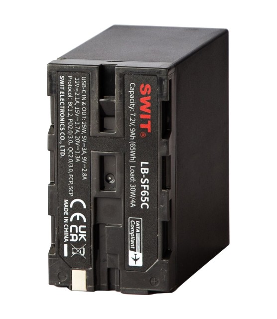 La SWIT LB‑SF65C es una batería NP‑F de 65 Wh para videocámaras digitales con una tensión nominal de 7,2 V, que ofrece una salida regulada D‑tap de 12 V y una entrada/salida USB‑C con una potencia de 25 W para alimentar una amplia gama de equipos de vídeo profesionales y accesorios. Proporciona una salida de hasta 30 W/4 A, admite carga rápida a través de USB-C (carga completa en aproximadamente 3,5 horas) y también se puede cargar con cargadores NP-F estándar, lo que la convierte en una fuente de alimentación flexible para monitores, luces, grabadoras y otros equipos de campo . Aviso: esta batería no se puede utilizar para alimentar cámaras Sony.