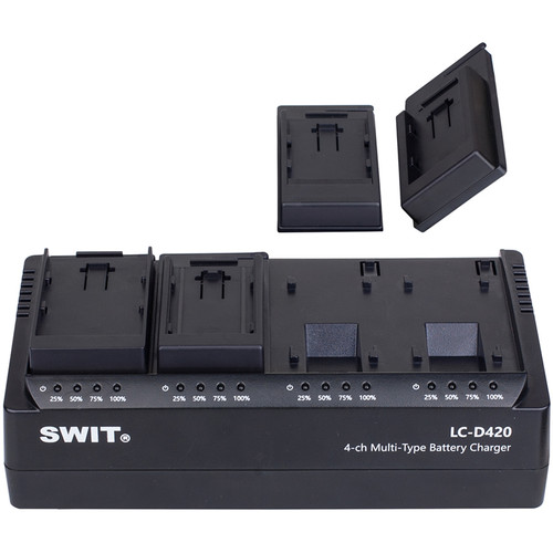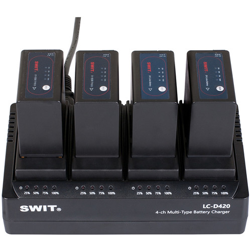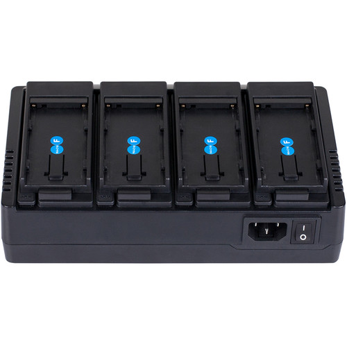 Cargue hasta cuatro baterías a la vez con el cargador simultáneo de cuatro canales DV SWIT. Se suministra con cuatro bandejas para baterías compatibles con las baterías Sony de la serie NP-F y las baterías SWIT S-8972, S-8970 y S-8770, y puede sustituirlas fácilmente por otras bandejas compatibles. Cada ranura se carga con una corriente de 2 A y el indicador LED de alimentación le informa del estado de carga de cada batería. Manténgase siempre con energía y listo para la acción con este eficaz y versátil cargador de baterías.
