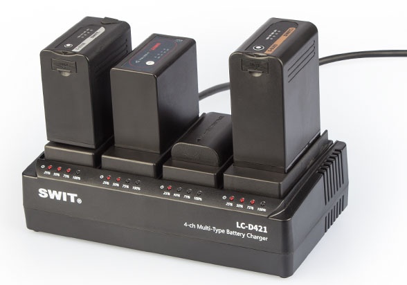Cargador SWIT LC-D421 de 4 canales con bandejas para baterías intercambiables. El cargador LC-D421 incluye el cargador propiamente dicho (sin placas), al que se le pueden acoplar hasta 4 placas de batería diferentes para cámaras Sony, Panasonic, JVC o Canon. Una solución económica si tienes varias baterías y dispositivos diferentes: un solo cargador para casi todas las baterías y dispositivos.