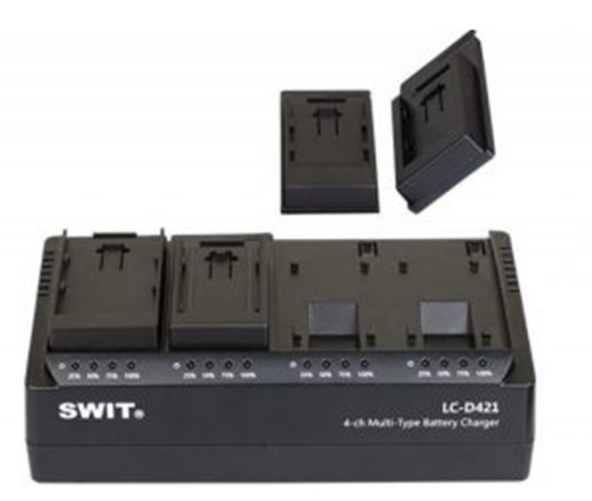 El SWIT LC-D421V KIT es un cargador profesional de 4 canales para baterías DV que se suministra con 4 placas del tipo JVC BN-VF. Gracias a su salida de 2 A por canal y a los indicadores LED de carga, es capaz de cargar hasta cuatro baterías DV simultáneamente en aproximadamente una hora.