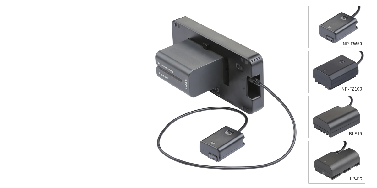 El SWIT MA-55C2 es un adaptador de batería ficticia Sony NP-FZ100 para el monitor HDMI 4K SWIT CM-55C y está diseñado para alimentar dispositivos externos desde el monitor, por ejemplo, para la Sony ?7III, ?7RIII o ?9. Si el monitor se alimenta con batería, la toma BATT OUT puede alimentar cámaras desde una fuente de alimentación de batería de CC mediante adaptadores de batería ficticia.
