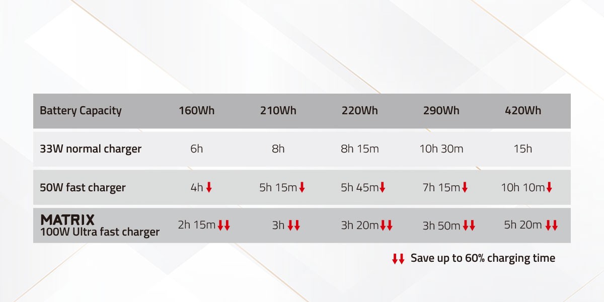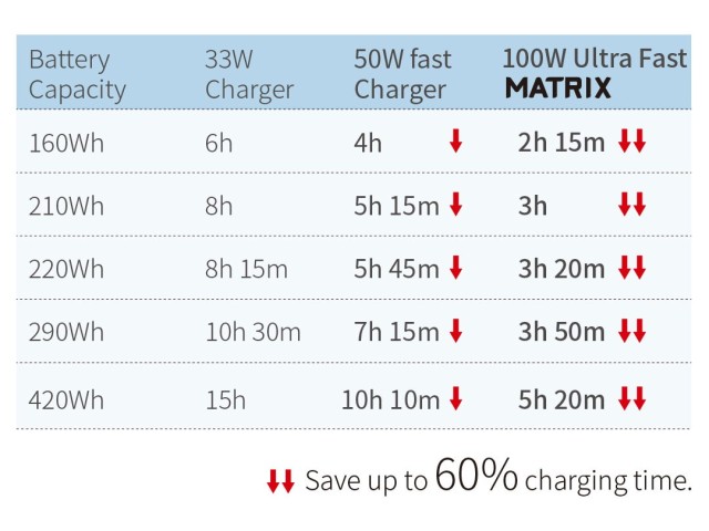 El cargador ofrece una potencia total máxima de 900 W, distribuida entre ocho canales de carga independientes. Para las baterías SWIT de 14,4 V con una capacidad de 160 Wh o superior, cada canal proporciona 16,8 V CC a una corriente máxima de 6 A, lo que equivale a una potencia de 100 W por canal. En el caso de las baterías SWIT de 28,8 V con una capacidad similar, cada canal proporciona 33,6 V CC con una corriente máxima de 3 A, lo que también da una potencia de 100 W por canal. Las baterías de otros fabricantes admiten 16,8 V CC con una corriente máxima de 3 A, lo que genera 50 W por canal. El cargador admite una tensión de entrada de CA de entre 100 V y 240 V a 50/60 Hz, lo que permite una compatibilidad global con diversos estándares eléctricos.