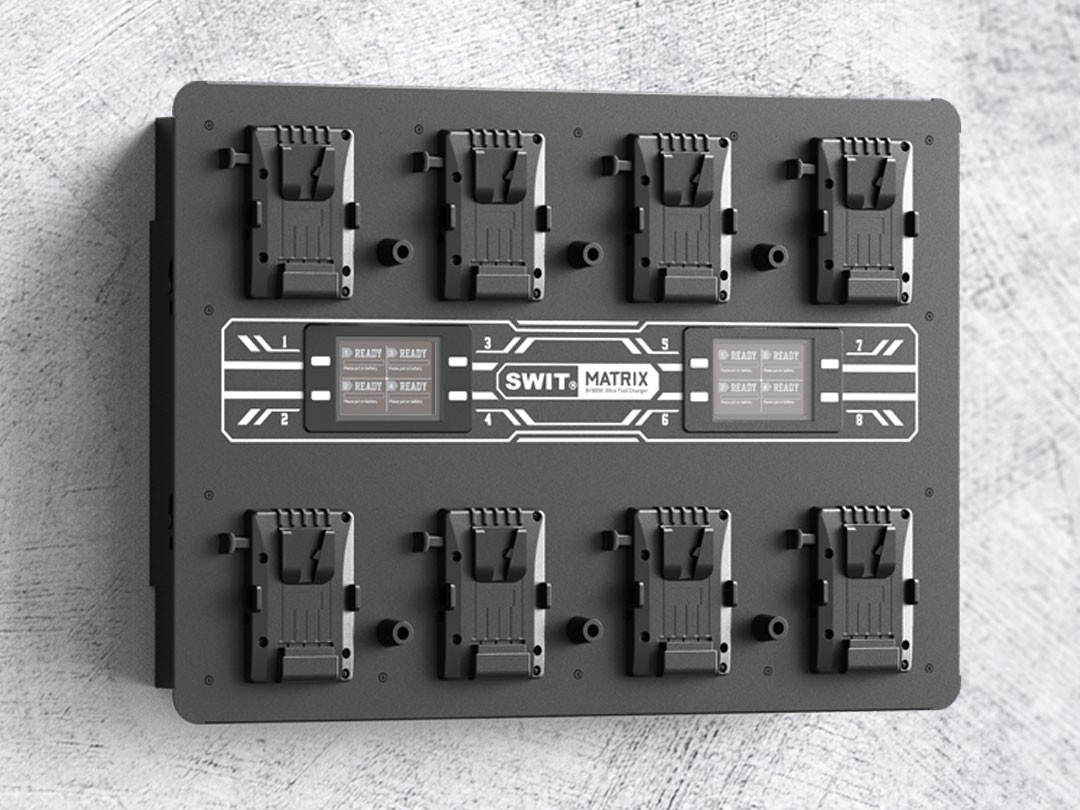 El SWIT MATRIX-S8 es un cargador profesional simultáneo de 8 canales con montura en V, diseñado para cadenas de televisión, empresas de alquiler y estudios de producción que necesitan una solución para cargar baterías de alta capacidad. Este cargador ultrarrápido proporciona 100 W por canal y es compatible con formatos de baterías V-mount de 14,4 V y 28,8 V, lo que lo convierte en la opción ideal para operadores que gestionan un inventario variado de baterías. El dispositivo está diseñado para reducir significativamente el tiempo de carga y, al mismo tiempo, mantener las baterías en buen estado gracias a una gestión inteligente del consumo de energía.