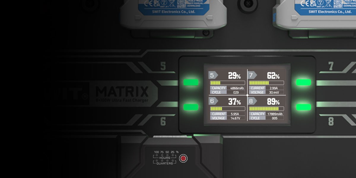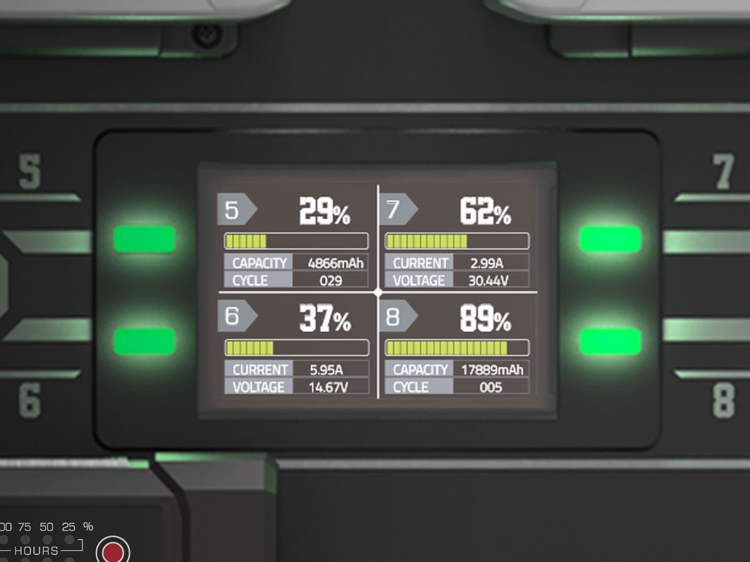 El MATRIX-S8 está equipado con dos pantallas LCD en color de 3,5 pulgadas que permiten supervisar cada canal de carga en tiempo real. Estas pantallas muestran el progreso de la carga, la corriente de carga, la tensión de salida y la información sobre el número de ciclos de la batería, lo que garantiza una transparencia continua del sistema. Los grandes indicadores LED de carga complementan las pantallas LCD y permiten al operador evaluar rápidamente el estado de la carga a distancia, sin tener que acercarse directamente a la unidad, lo que facilita una gestión eficaz en instalaciones de producción con mucho tráfico.