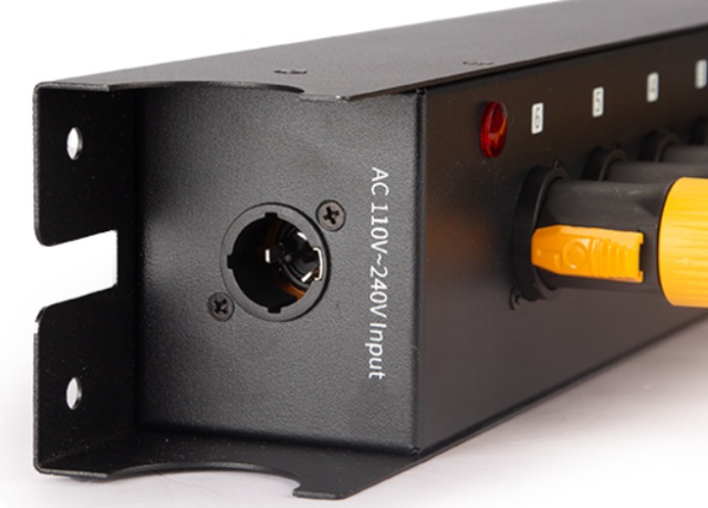 La PA-J616 admite un amplio rango de tensión de entrada de CA, desde 110 V hasta 240 V a 50 Hz, y proporciona una carga máxima de hasta 3500 W con una corriente máxima de 20 A. Utiliza conectores aeronáuticos seguros de 3 hilos y 16 A con cierre por giro (twist-lock) tanto para la entrada como para la salida, lo que garantiza una conexión de alimentación segura y controlable. Cada línea de salida puede utilizarse para la conexión en serie de luminarias, lo que resulta ideal para instalaciones en las que varias lámparas se alimentan desde un único punto de distribución.
