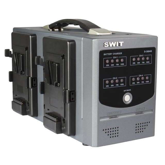 El SWIT PC-P430S es un cargador de baterías V-mount de 4 canales totalmente simultáneo con un indicador LED del estado de carga de cada batería. El cargador PC-P430S cuenta con 2 salidas de alimentación XLR de 4 pines.