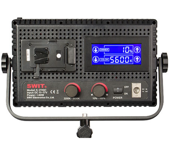 La intuitiva pantalla LCD táctil permite un control rápido y preciso de la temperatura de color y los niveles de atenuación. Para un funcionamiento flexible, el modelo S-2110CS puede alimentarse con una batería V-mount para uso móvil o con un adaptador CA-CC para instalaciones de estudio. El soporte integrado en forma de U y el soporte estándar para trípode garantizan una colocación sencilla y una instalación segura.