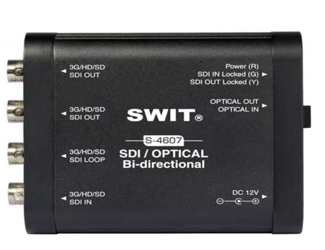 El SWIT S-4607 es un convertidor bidireccional resistente y portátil de 3G-SDI a fibra óptica monomodo. Está diseñado para la transmisión SDI a larga distancia, admite la conversión simultánea de SDI a fibra óptica y de fibra óptica a SDI, cuenta con módulos ópticos intercambiables en caliente y se suministra en una carcasa de aluminio resistente con opciones de instalación sencillas.