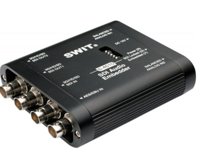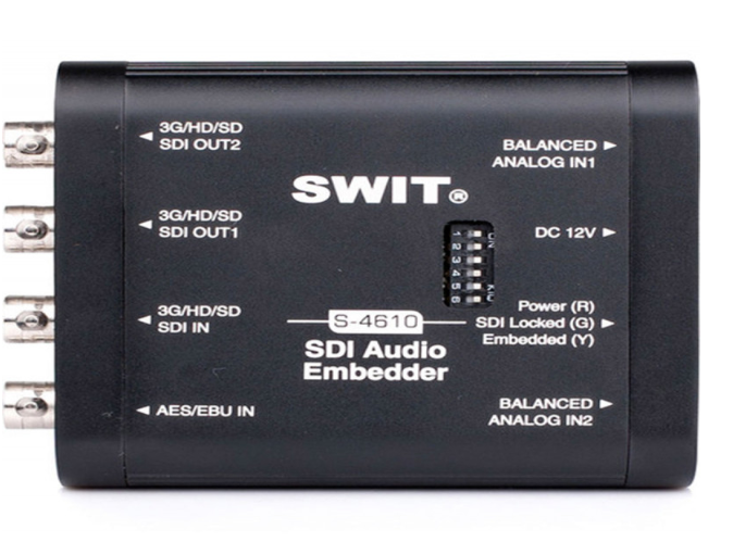 El SWIT S-4610 es un integrador de audio SDI compacto y resistente que integra audio digital y analógico en señales SDI y ofrece salidas fiables de 3G/HD/SD-SDI para producciones profesionales sobre el terreno y aplicaciones de retransmisión.