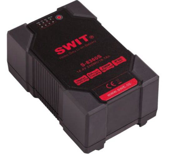 La SWIT S-8360S es una batería de iones de litio de 240 Wh para uso intensivo con montura en V, que destaca por su resistente diseño impermeable con doble carcasa, su alta potencia de 200 W y su carga rápida de 6 A, lo que la convierte en la opción ideal para aplicaciones cinematográficas y ENG exigentes sobre el terreno.