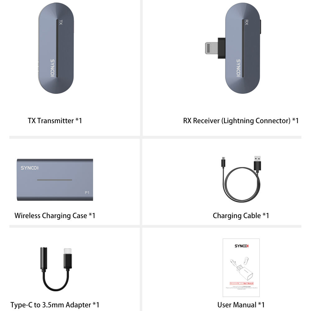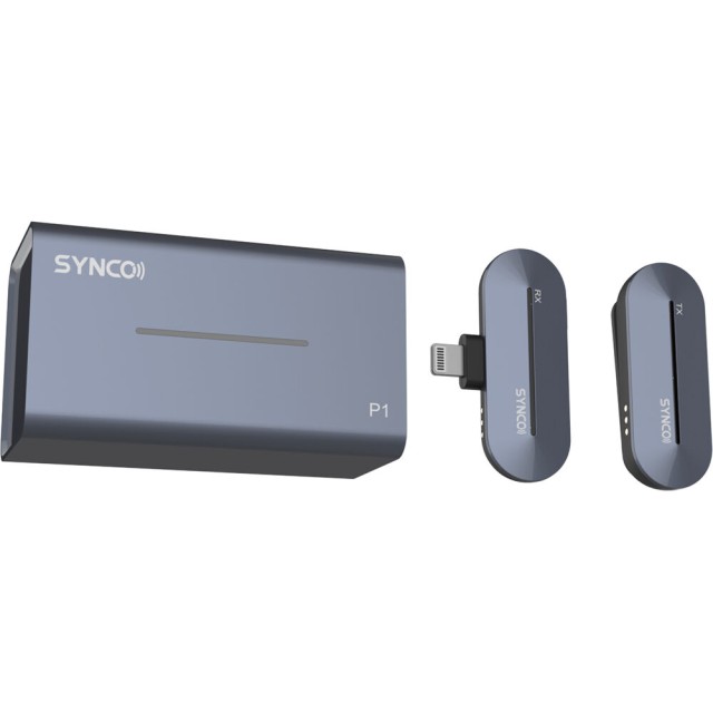 Synco P1 es una gama de micrófonos inalámbricos para iPhone (modelo P1L con conector Lightning) y teléfonos con sistema Android (modelo P1T con conector USB-C). El kit P1 incluye un transmisor inalámbrico con micrófono integrado, un receptor que se puede acoplar al dispositivo y un estuche de carga portátil. El receptor se acopla directamente al puerto del teléfono y proporciona una conexión digital directa con el dispositivo. El transmisor, del tamaño de un auricular, se coloca directamente sobre el intérprete.