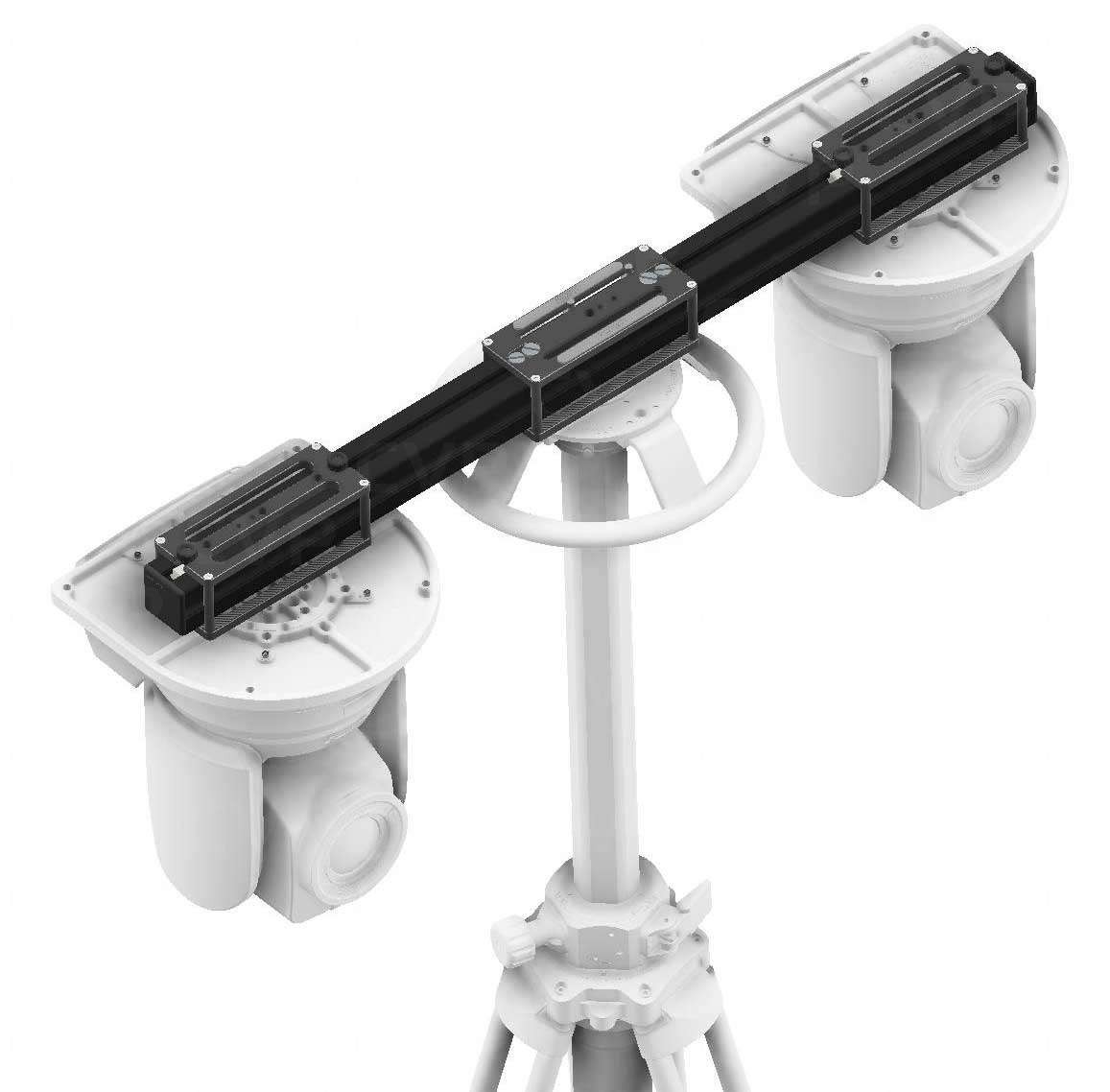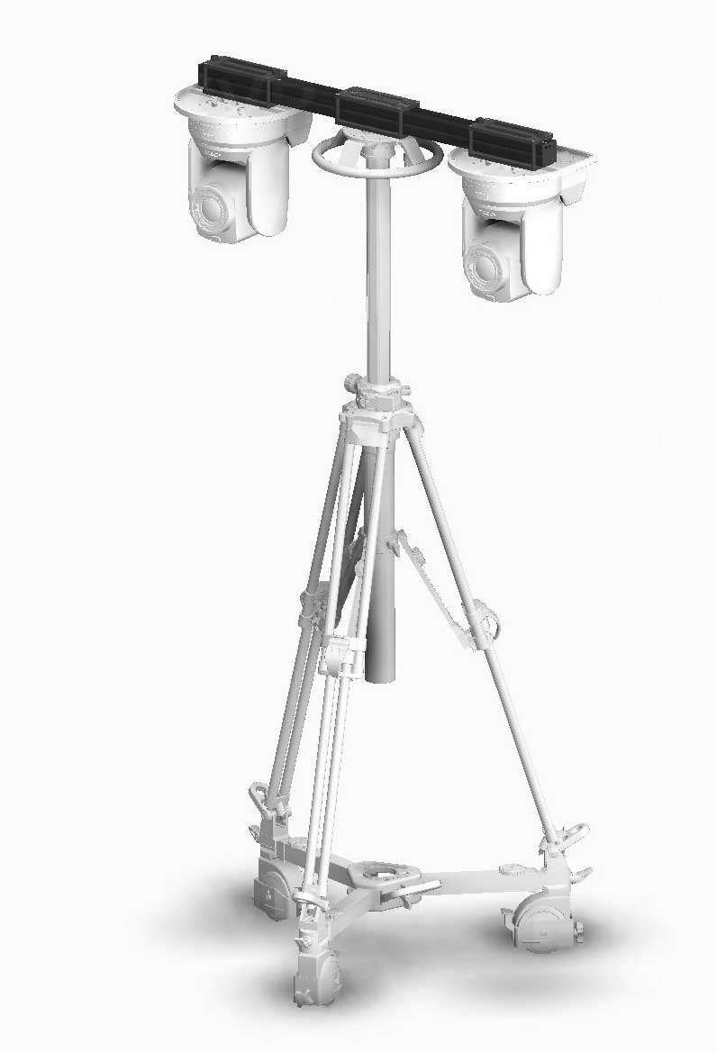 Tenga en cuenta que la cámara no está incluida en este producto. Este soporte está diseñado para soportar hasta tres cámaras PTZ con un patrón de montaje alineado. Es compatible con todas las bases, trípodes Mitchell y todos los soportes Cartoni PTZ.