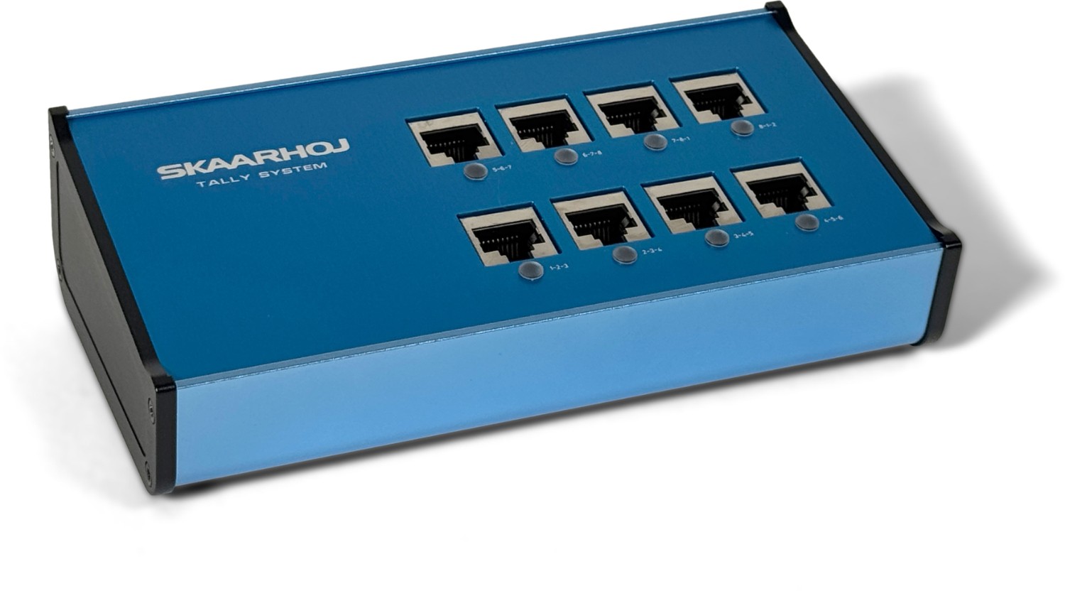 Eth-Tally Box es un sistema externo de luces de señalización sencillo pero potente, diseñado para la radiodifusión, la producción en directo y entornos audiovisuales. Proporciona una identificación visual clara de las cámaras o altavoces activos y es compatible con protocolos de señalización tanto universales como propietarios, como TSL, Blackmagic, Sony, TriCaster y otros. El sistema admite hasta 8 luces de control por cable SKAARHOJ conectadas a un Tally Box Ethernet, ofrece una integración fluida y una fácil implementación con la tecnología Power over Ethernet (PoE) y garantiza un control fiable de las señales de control en una amplia gama de dispositivos.