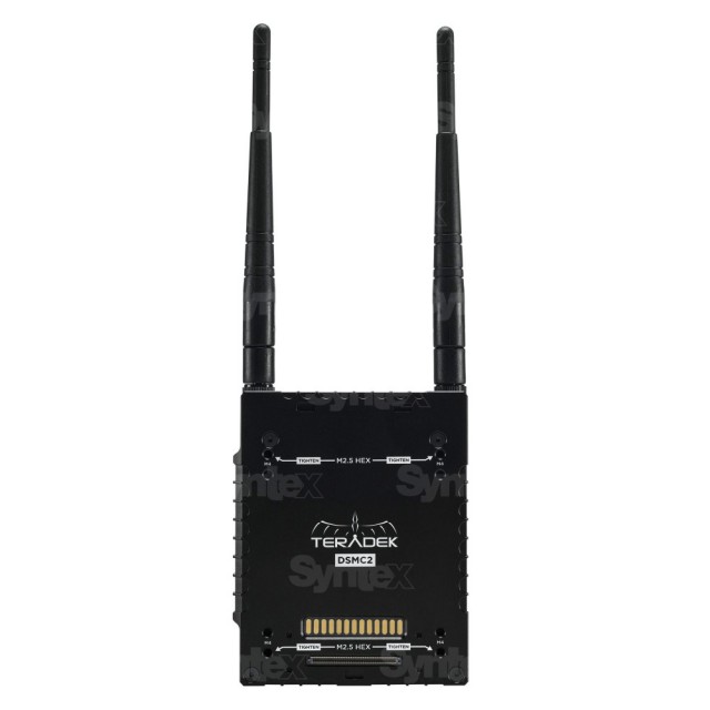 El conector POGO integrado conecta la cámara RED y utiliza el sistema de conectores RED POGO, que suministra corriente y asegura la parte trasera de la cámara DSMX2. Las antenas incluidas proporcionan una señal potente que puede alcanzar hasta 150 metros. El transmisor admite hasta cuatro receptores y el cifrado AES-128 integrado protege tu vídeo de miradas indiscretas, mientras que la función de supresión de ruido mantiene tu vídeo nítido, incluso cuando se trabaja en las frecuencias de 2,4 y 5,8 GHz.