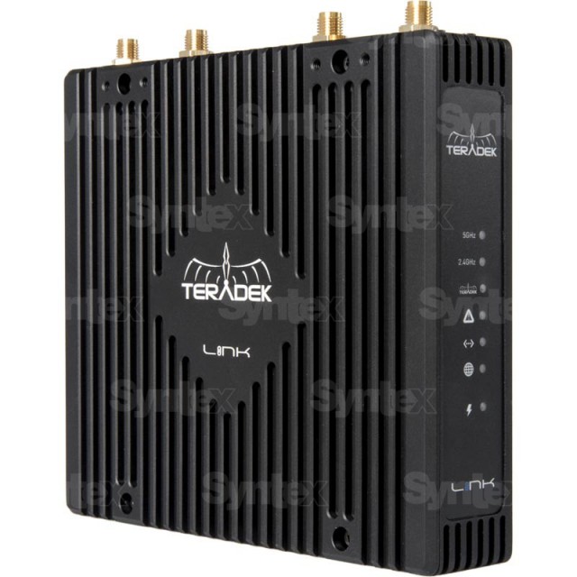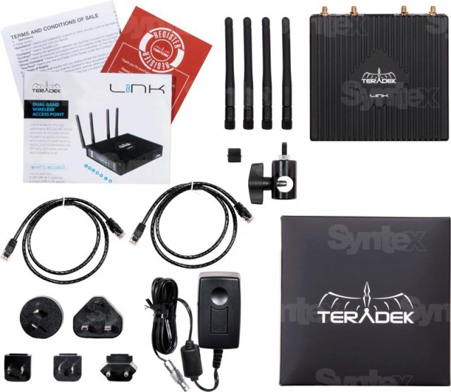El router Wi-Fi de doble banda Teradek Link, diseñado para conectar equipos de vídeo profesionales, es más resistente que los módems y puntos de acceso de consumo y, además, en lugares remotos puede alimentarse mediante una batería con montura en V disponible por separado. Los dispositivos Teradek que utilizan Wi-Fi pueden beneficiarse del mayor ancho de banda que ofrece el Link y de su alcance de 300 metros. Para una mayor versatilidad de montaje, se incluye un adaptador para trípode. El paquete también incluye una fuente de alimentación, un cable D-Tap de 2 pines y un cable Ethernet.