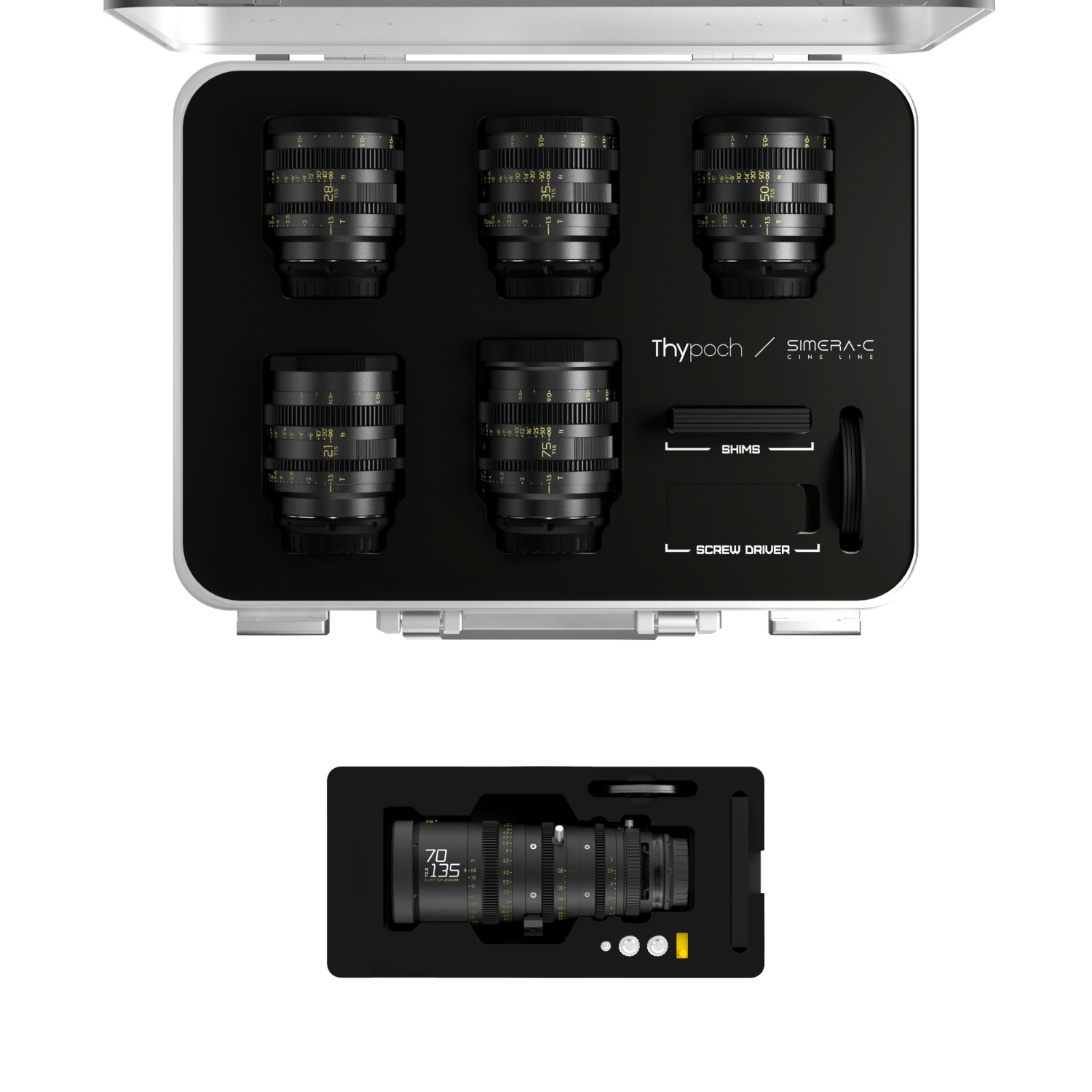 Juego de objetivos de alta gama Thypoch Simera-C de distancia focal fija + objetivo zoom DZOFILM Catta Zoom 70-135 mm. El rango total de distancias focales de 21 a 135 mm cubre diversas necesidades creativas.
