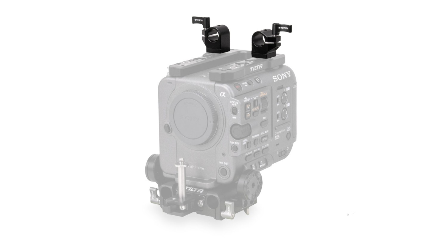 Este juego de dos soportes de 15 mm para una sola barra se fija a la placa superior multifuncional de la Sony FX6 y permite montar accesorios desde arriba, ya sea delante o detrás del cuerpo de la cámara.