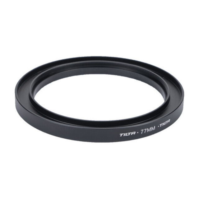 Anillo adaptador Tilta para la caja mate Tilta Mirage (77 mm), destinado a acoplar un objetivo con rosca para filtro de 77 mm a la caja mate Tilta Mirage. El anillo adaptador cuenta además con una rosca interior de 77 mm en la parte delantera, lo que permite colocar un filtro en el objetivo.