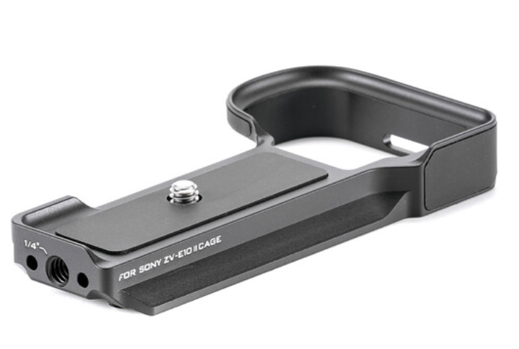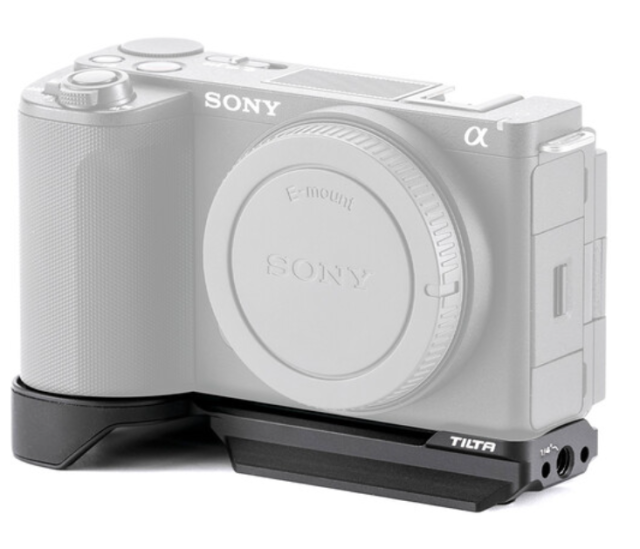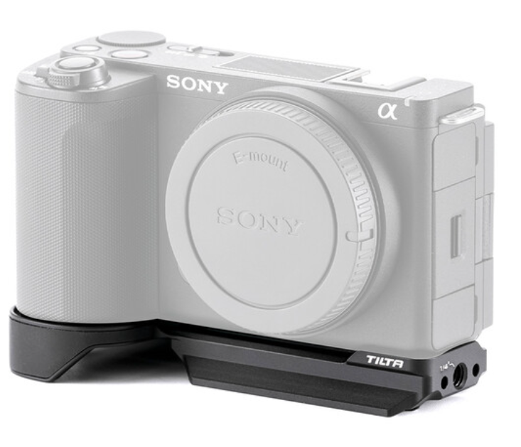 La Tilta TA-T69-ABP-B, diseñada específicamente para la Sony ZV-E10 II, es una placa inferior tipo Arca ultraligera pero resistente que convierte esta compacta cámara para vlogs en un dispositivo totalmente preparado para su uso con un gimbal y un trípode. Su ingenioso diseño envolvente se ajusta firmemente alrededor de la base del mango para evitar cualquier torsión o aflojamiento accidental, mientras que los bordes Arca-Swiss integrados encajan directamente en cabezales, abrazaderas o placas de fijación rápida compatibles de la serie DJI RS sin necesidad de adaptadores. Otras opciones de fijación incluyen varias roscas de 1/4"-20 en la parte inferior, una rosca vertical especial antitorsión en el lateral y una zapata fría integrada para micrófonos o luces.