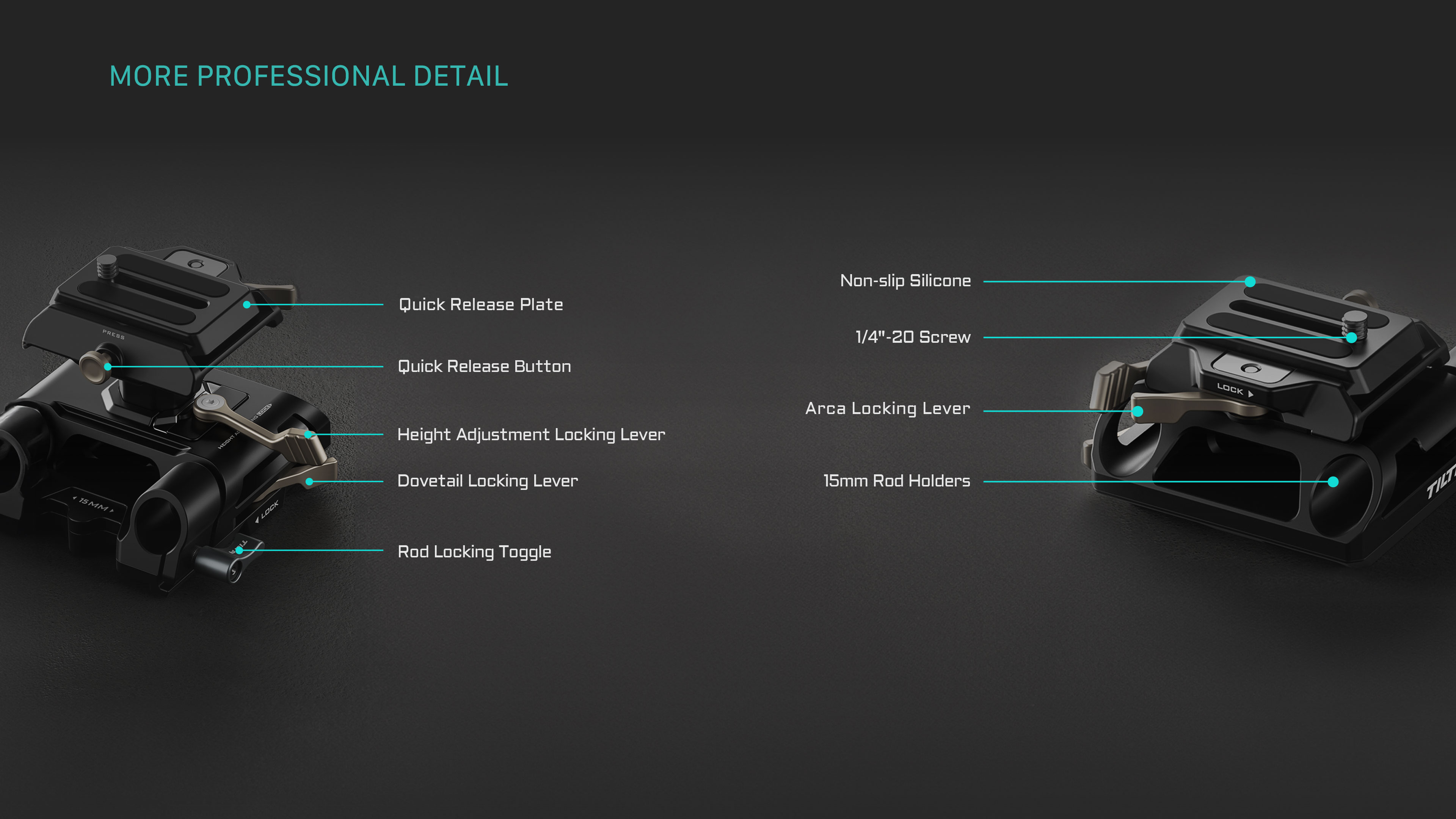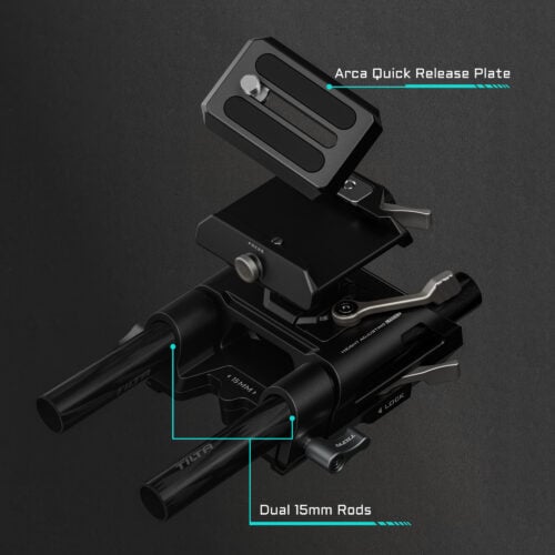 La parte inferior de la placa base es compatible con los soportes estándar de Tilt y también está equipada con roscas de 1/4″-20 para su fijación a trípodes y otros sistemas de soporte.