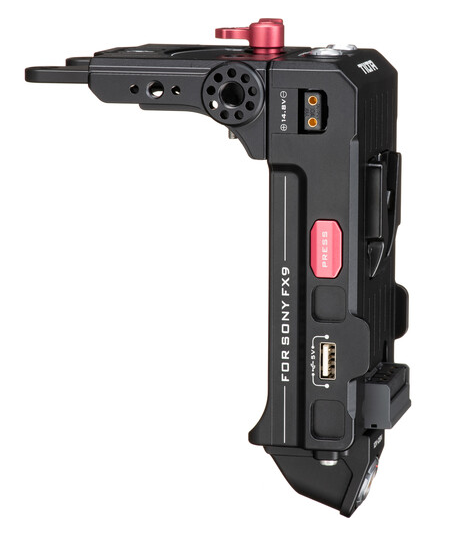 El ES-T18-BTP3-V, diseñado específicamente para el sistema de jaula Tilta FX9, sustituye la placa estándar de la cámara por una solución V-Mount limpia y totalmente integrada que se adapta perfectamente a la parte trasera de la FX9. Una batería V-Mount de 98-190 Wh alimenta todo el dispositivo a través de una amplia gama de salidas reguladas: tres puertos D-Tap de 14,8 V, dos salidas LEMO de 2 pines de 14,8 V, un puerto USB-A de 5 V y una entrada LEMO de 6 pines (12-28 V), que admite adaptadores de corriente o baterías de bloque para una alimentación ininterrumpida. El cable corto integrado mantiene el cableado ordenado y la estructura de aluminio CNC mantiene el peso en unos razonables 900 g.