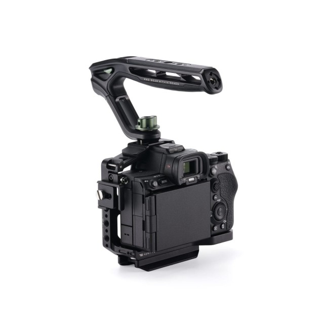Las especificaciones técnicas incluyen compatibilidad con los cuerpos Sony Alpha 7V, 7IV y 7R V; una estructura de semicaja de aluminio negro resistente; múltiples monturas de 1/4"-20 y pies de fijación; una base compatible con Arca-Swiss en ambas direcciones; una abrazadera para cables integrada; y el asa superior Xeno incluida. El mecanismo deslizante ajustable permite un ajuste fino para una sujeción precisa, mientras que todas las roscas están equipadas con puntos de posicionamiento antirrotación para fijar los accesorios de forma segura.