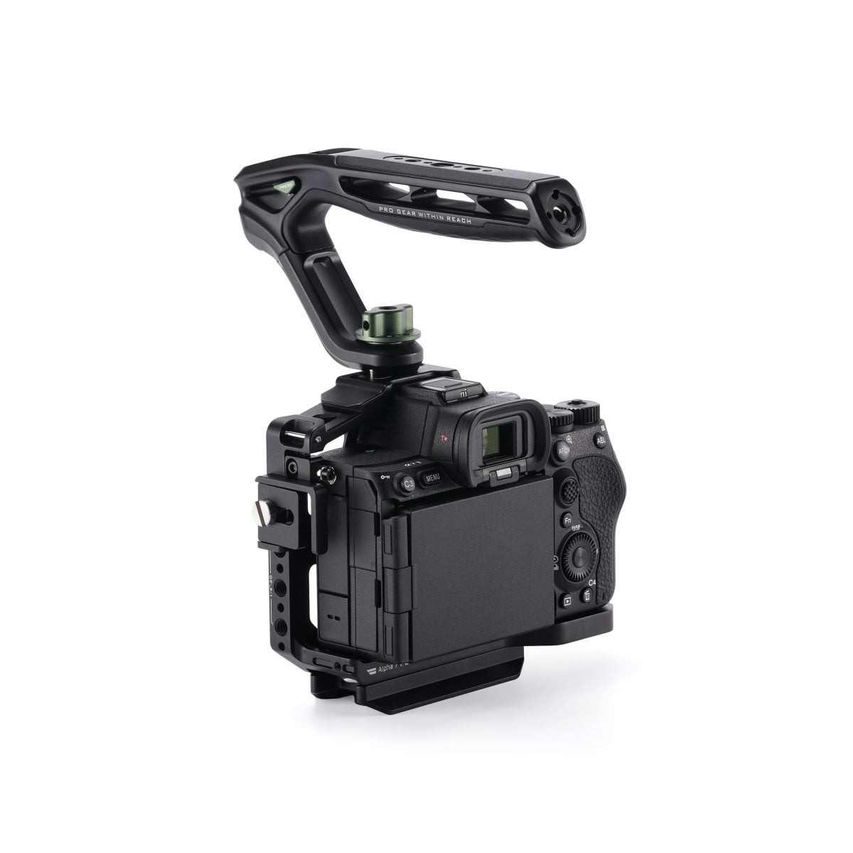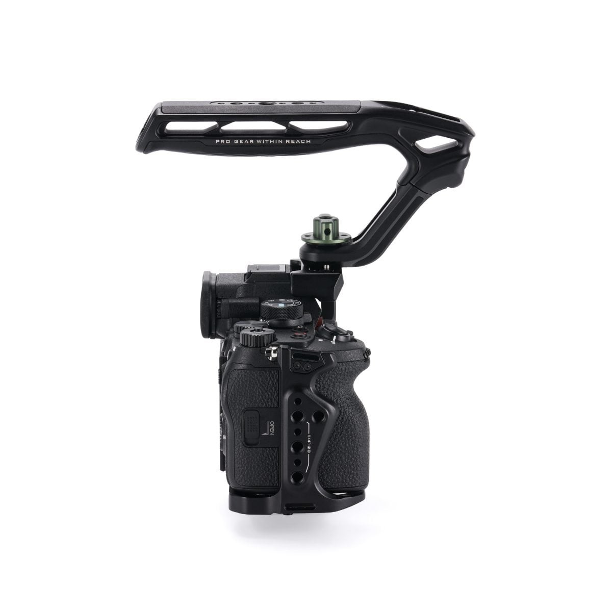 El kit incluye la empuñadura superior Tilta Xeno, que se fija mediante roscas de 1/4"-20, lo que aumenta la adherencia y la flexibilidad de control. Esta empuñadura superior amplía los puntos de montaje para accesorios adicionales y proporciona un mejor control durante la filmación manual. Su diseño ergonómico complementa el perfil ligero de la jaula sin comprometer la estabilidad.