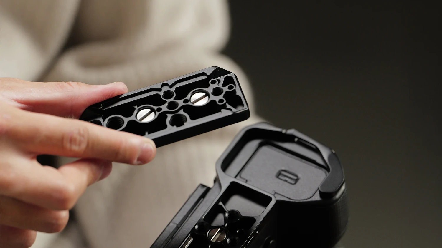 La placa inferior Arca-Swiss bidireccional integrada permite una fijación rápida y un ajuste sencillo de la posición tanto en cardanes como en trípodes. La jaula facilita la grabación vertical gracias a la posibilidad de acoplar empuñaduras mediante las roscas integradas de 1/4”-20.