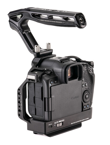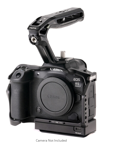 El kit básico del marco para cámara Tilta TA-T68-A-B con sistema de refrigeración es un accesorio ligero y versátil para la cámara Canon EOS R5 Mark II, que combina un marco protector adaptado a la forma de la cámara, un módulo inteligente de refrigeración activa con dos velocidades (alimentado por USB-C PD de 30 W), un completo juego de accesorios de montaje (patas frías, 1/4"-20 y 3/8"-16 con pasadores de posicionamiento), una base Arca-Swiss y el ergonómico asa superior Xeno, que ofrece una mejor gestión del calor que el propio asa de Canon y pesa solo 241 g.