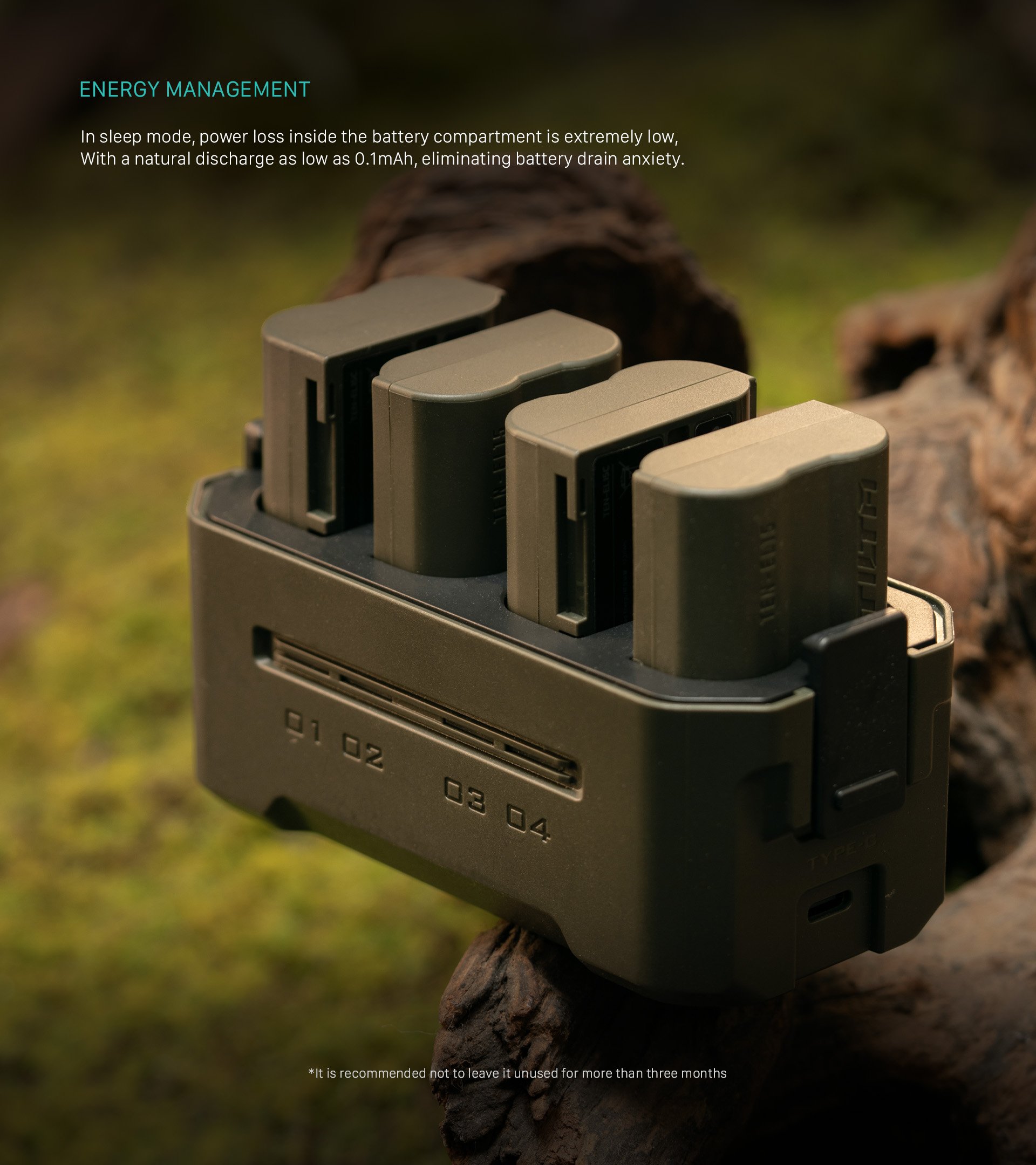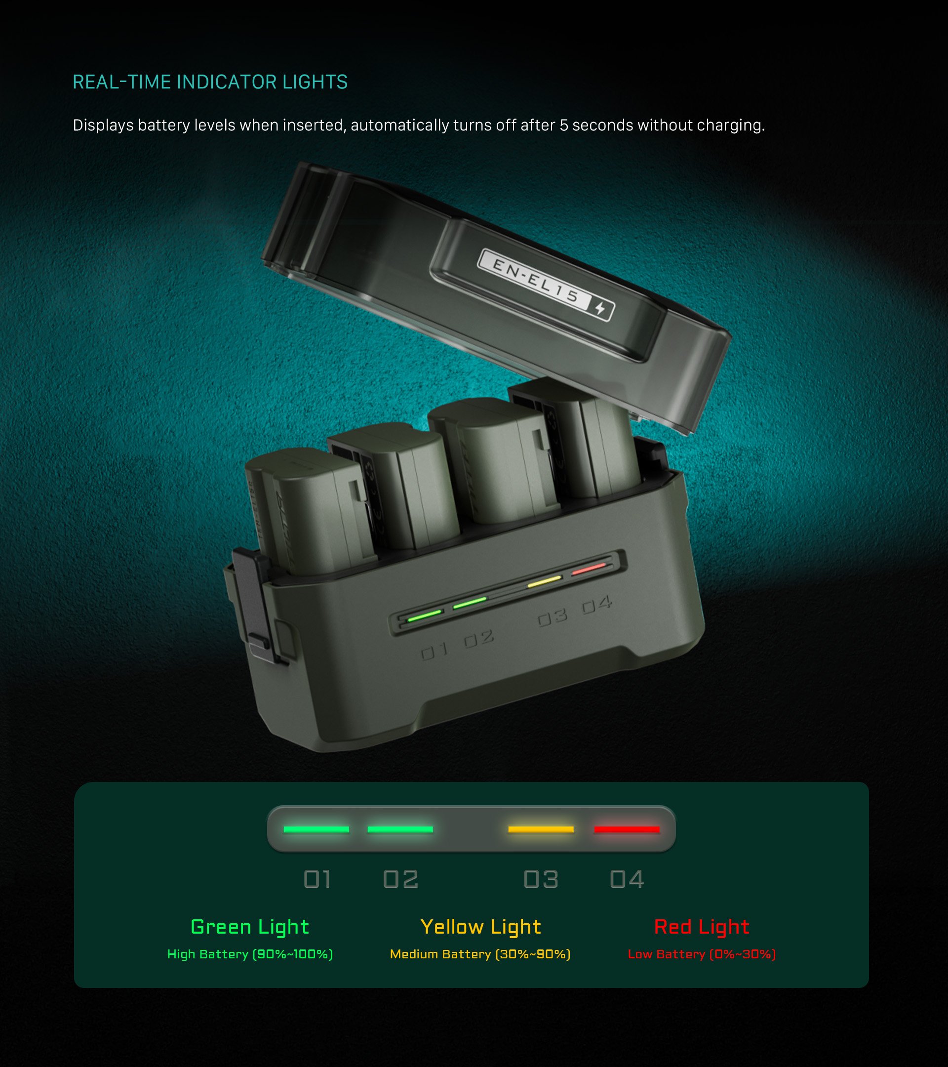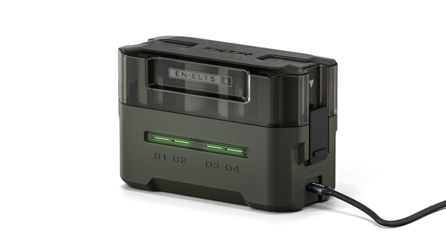 Esta compacta estación de carga está diseñada para admitir baterías EN-EL15C de Nikon y otros fabricantes, y ofrece cuatro ranuras para una carga sencilla y un almacenamiento cómodo.